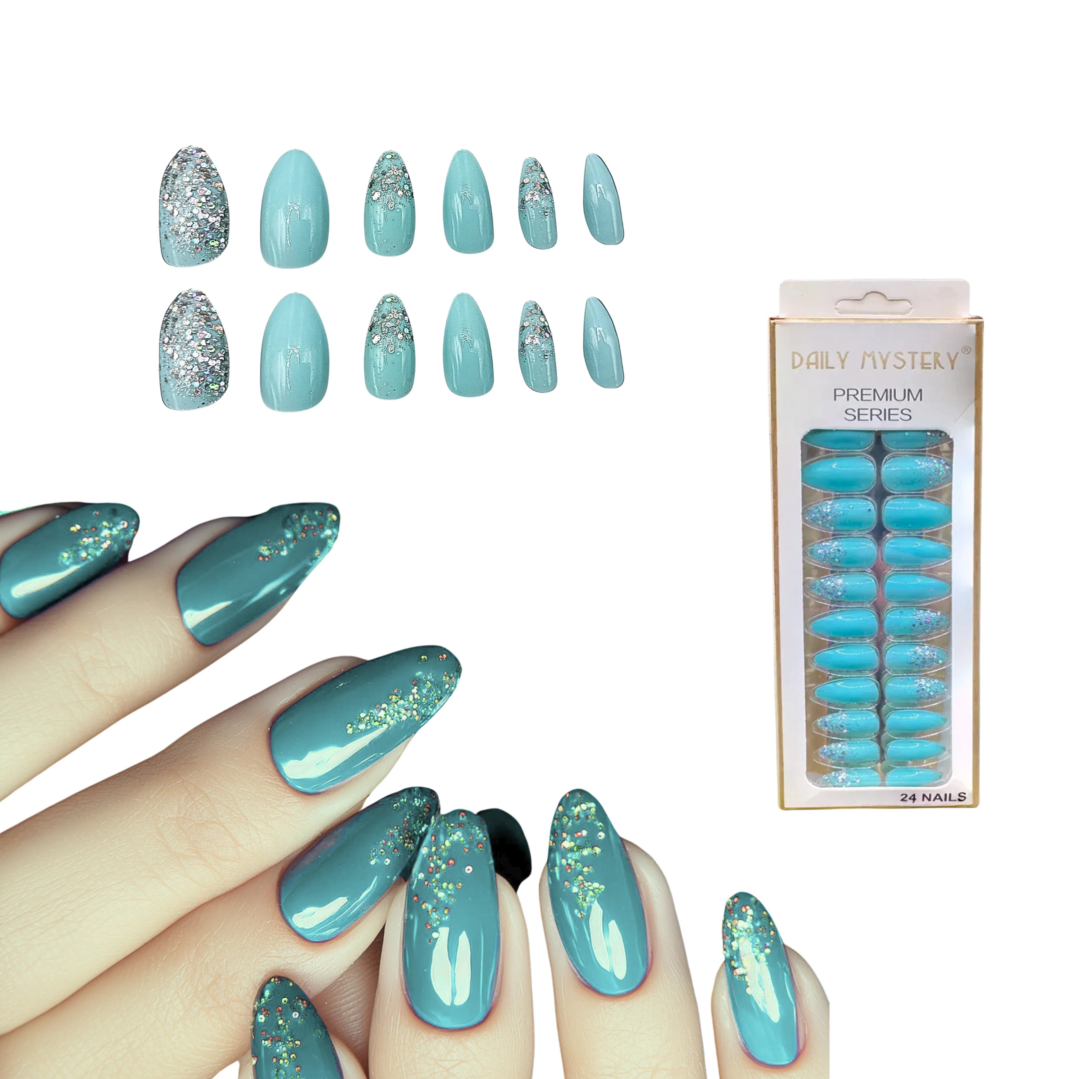 Set 24 Piezas de uñas azul zafiro con brillos postizas de cobertura completa en forma de almendra.