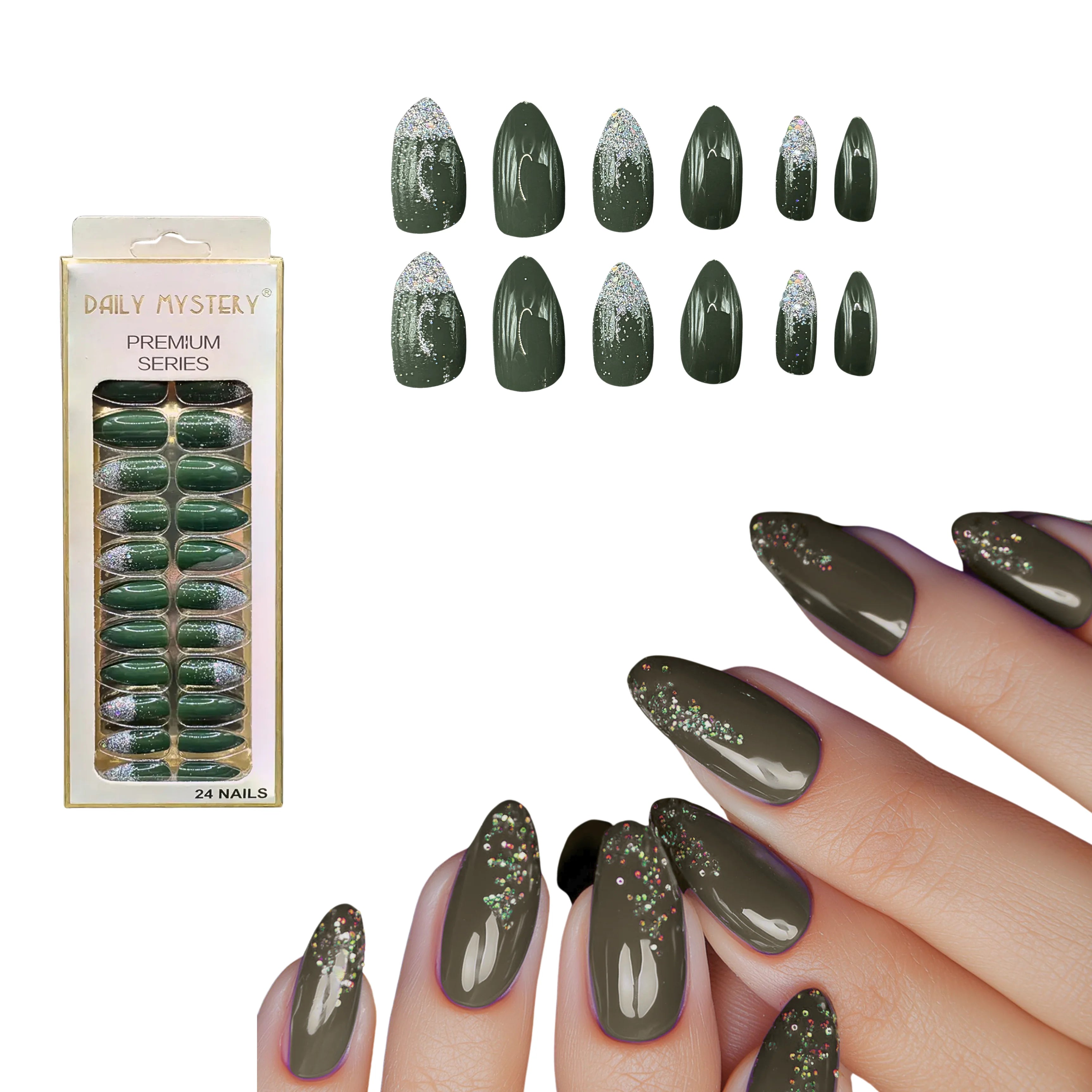 Set 24 Piezas de uñas postizas Verde oliva de cobertura completa en forma de almendra.