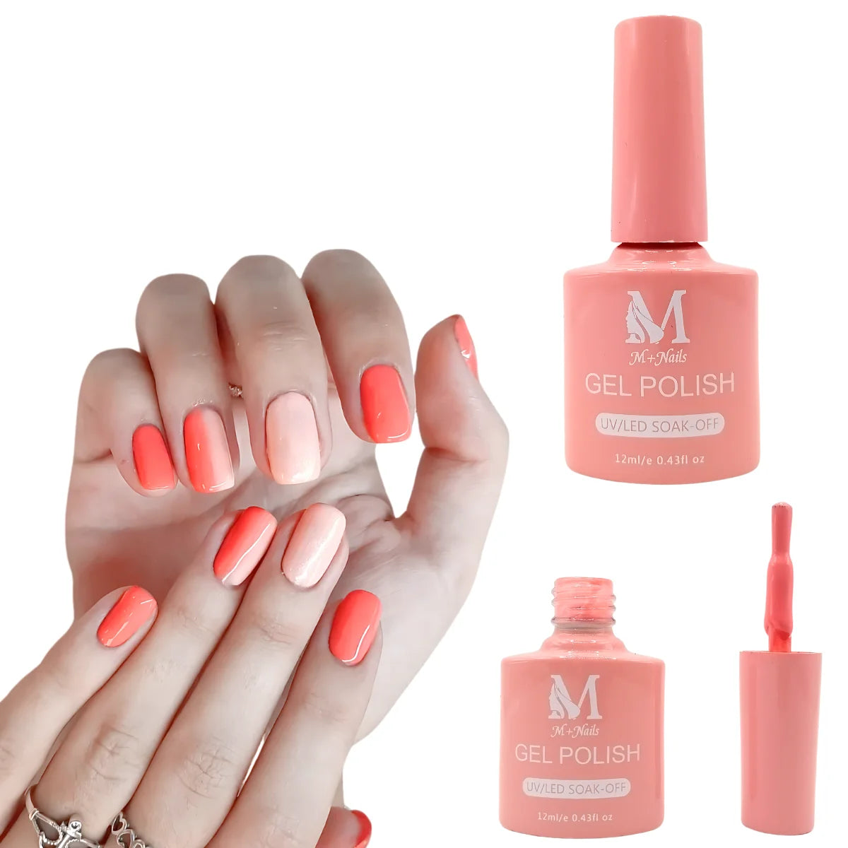 Gel polish UV/LED, color light coral, soak off. M+Nails.