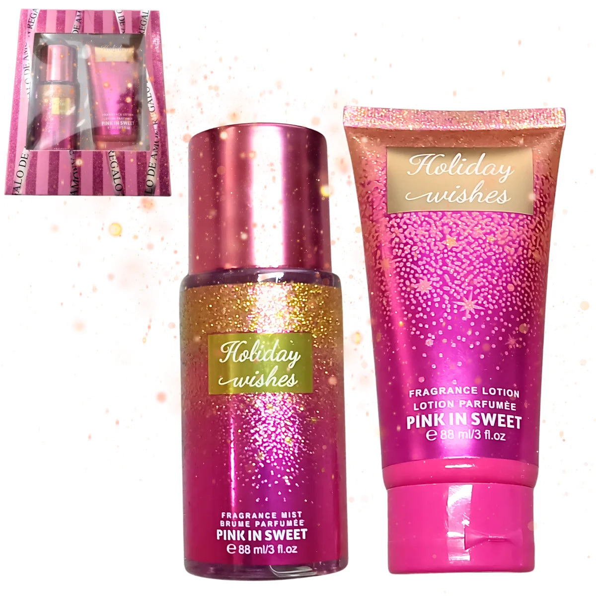 Empaque metalico con brillos. Holiday wishes. PINK IN SWEET. Fiusha metalico / Estrellas y brillos dorados.